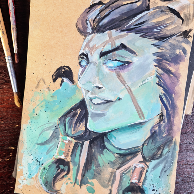 This is the original artwork of my humanoid Thresh portrait. It's a mixed media piece on brown 15x21cm +/- paper.